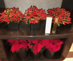 A Christmas tree and red and white poinsettia plants clustered around the house.