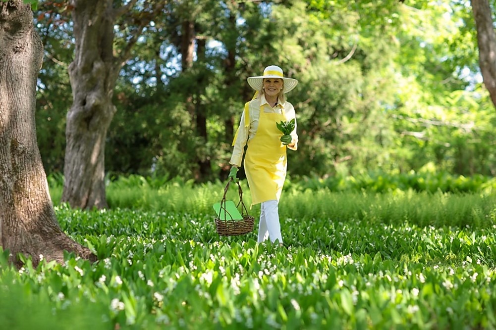 Audrey Gruss harvesting some lily-of-the-valley in her floral garden.