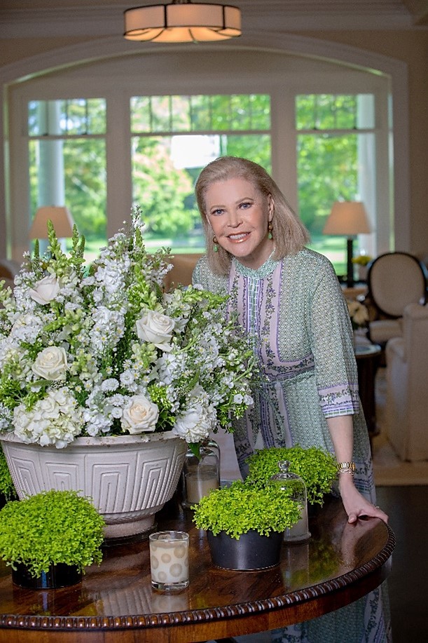 Audrey Gruss displaying the floral arrangements in her home.